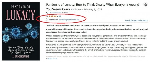 My wonderful readers will want to know that my new book Pandemic of Lunacy: How to Think Clearly When Everyone Around You Seems Crazy is still climbing in the ratings. I posted on February 6th that it was Amazon’s #1 New Release in its subject area in the audiobook category -- and it’s now the #1 New Release in its subject area in the hardcover and kindle categories as well. I show it above, but you can also click on the book’s Amazon page and look at the badge under the title.